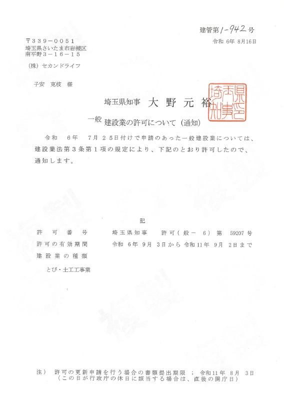 | 免許 | 建設業者登録番号 埼玉県知事許可(般-6)第59207号 | |